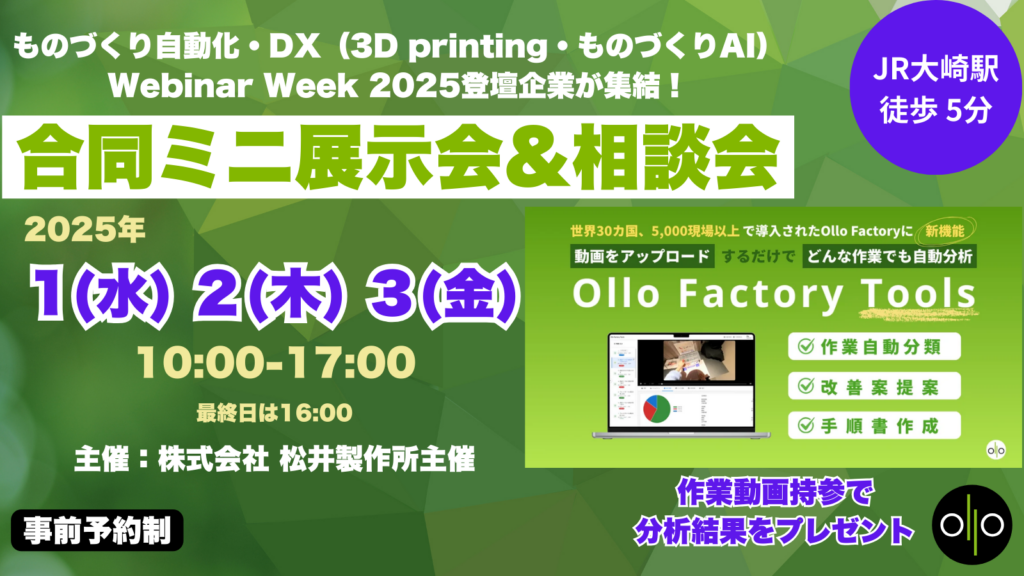 このたび松井製作所東京本社にて、「ものづくり自動化・DX Webinar Week連動 合同ミニ展示会&相談会」を開催します。09/11 の講演 最新の作業分析AIによる ムダ抽出・手順書作成・改善案作成の自動化 ★世界30カ国 5000現場で採用 にてご紹介した 作業改善ツール「Ollo Factory Tools」を展示いたします。ご興味のある方は奮ってご参加ください。